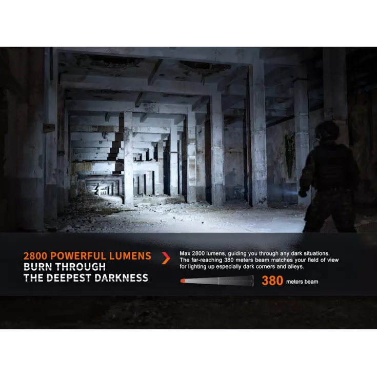 The Fenix PD36R Pro rechargeable flashlight has an impressive maximum output of 2800 lumens created by the Luminus SFT70 LED and a maximum beam distance of 380 meters.