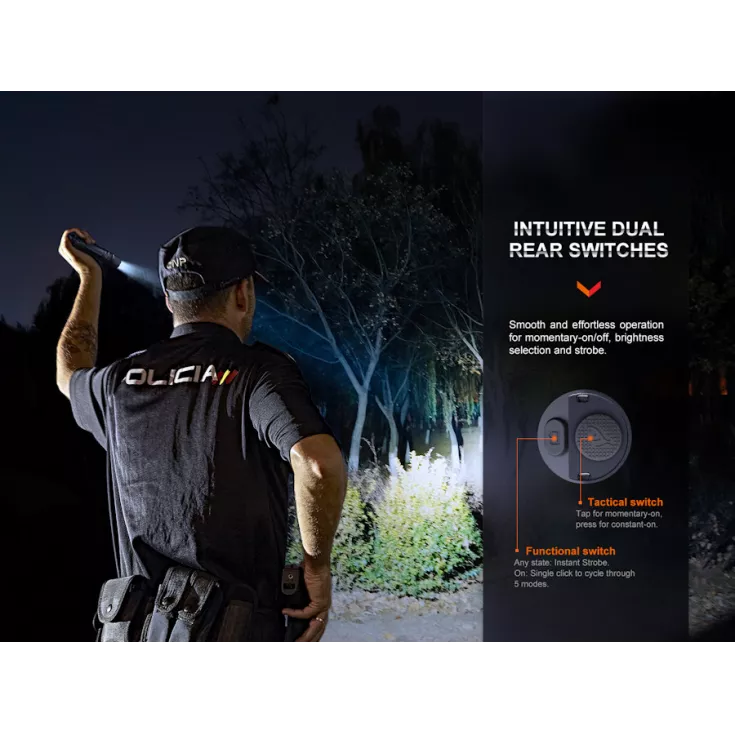 The flashlight features a dual switch tail cap controlling all functions and allows speedy access to the 2800 lumen emergency strobe output, even when the torch is off. A large power button operates momentary and constant-on lighting whilst a smaller mode button changes brightness levels and accesses strobe output.