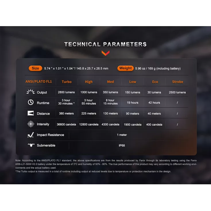 Turbo: 2800 lumens, 3hr 30mins runtime, 380 meter beam distance