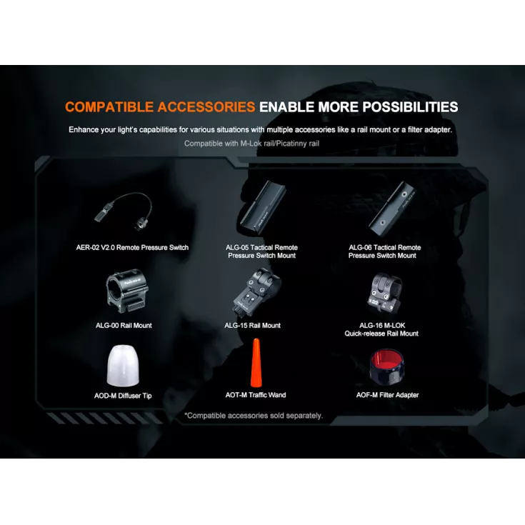 Picatinny rail mount (ALG-00), picatinny rail mount (ALG-15), M-Lok rail mount (ALG-16), remote switch (AER-02), picatinny remote switch mount (ALG-05), M-LOK remote switch mount (ALG-06), traffic wand (AOT-M), filter adaptor (A0F-M (AD302), diffuser tip (A0D-M)