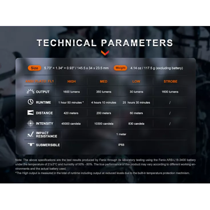 The torch can be both hand held or weapon-mounted. Contact springs at both ends of the battery compartment protect the battery from recoil/impact and ensures an excellent electrical contact under all conditions.