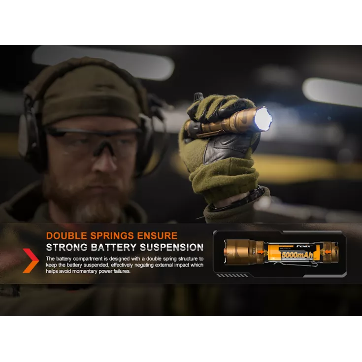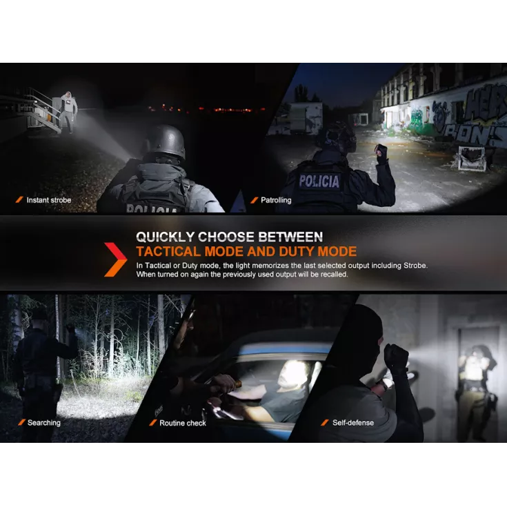 The flashlight offers two modes , Tactical mode with turbo and strobe or Duty mode with 4 different brightness levels. Featuring a strike face bezel, the flashlight is ideal for both handheld and weapon mounted use. Dual springs provide and protect the battery recoil ensuring an excellent and consistent electrical contact under all conditions.