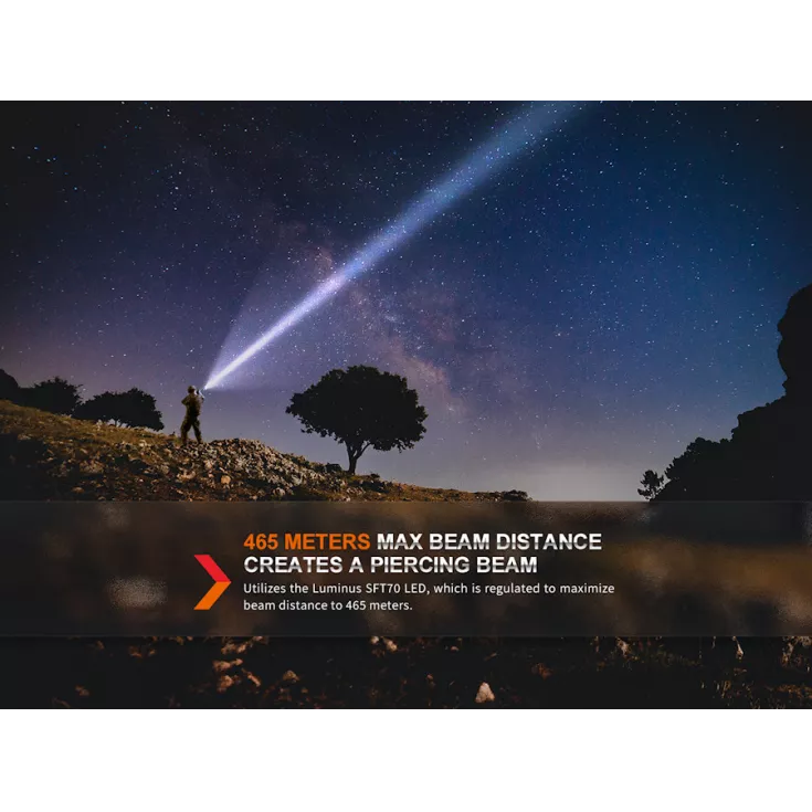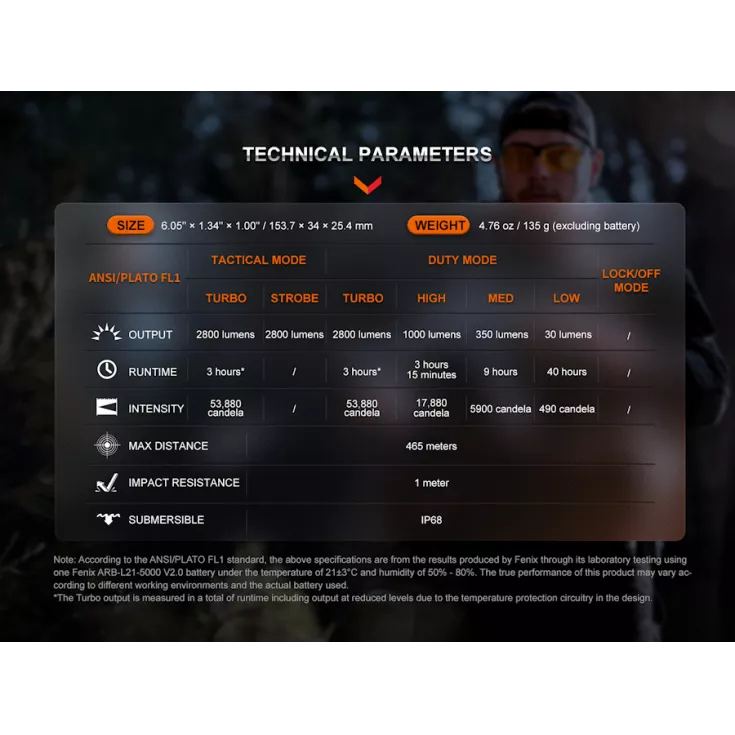 Turbo: 2800 lumens (3 hrs, inc temperature and battery level step downs) – 465m beam. Full power can be re-set when the torch cools)