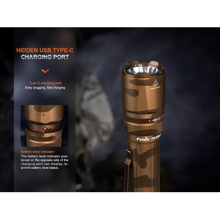 The TK20R UE is exceptionally durable with a body made from aircraft grade aluminium and finished with a hard anodized anti-abrasive finish. It can be recharged using the USB-C charging port hidden behind a threaded sleeve to provide complete waterproofing.