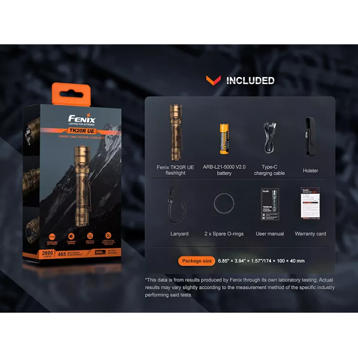 Included: 1 x TK20R UE, 1 x 21700 Li-ion battery, 1 x USB-C charging cable, 1 x Holster, 1 x Lanyard, 2 x Spare o-rings