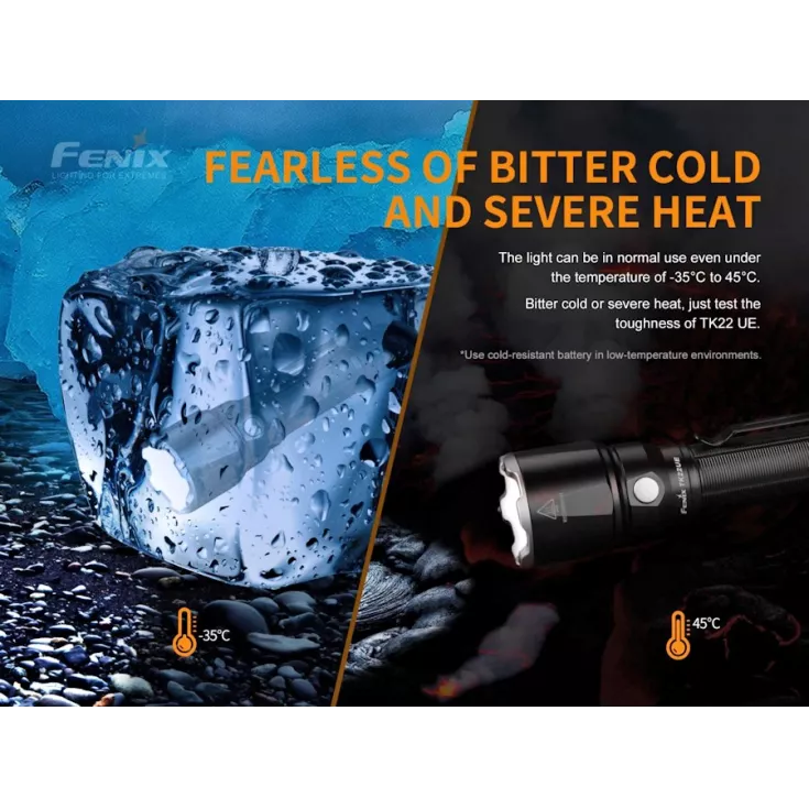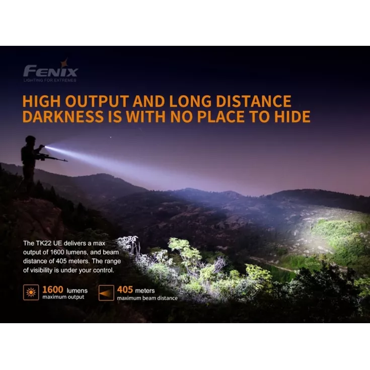 The Fenix TK22 Ultimate Edition (UE) torch offers a maximum output of 1600 lumens from the Cree Luminus SST 40 LED. The flashlight can be powered using either 1 x 21700 Li-ion or 18650 Li-ion battery when using the included battery magazine.