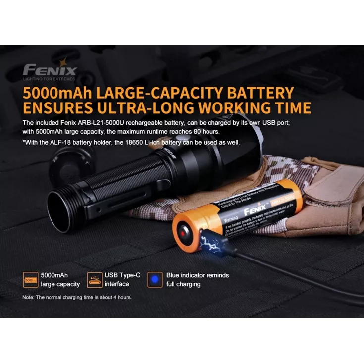 Fenix TK22 Includes: Fenix ARB-L21-5000U 21700 5000mAh Li-ion battery, USB Type-C charging cable, Fenix ALF-18 18650 battery holder, holster, lanyard, spare o-ring.