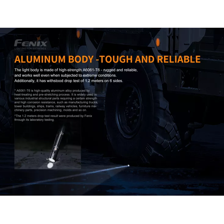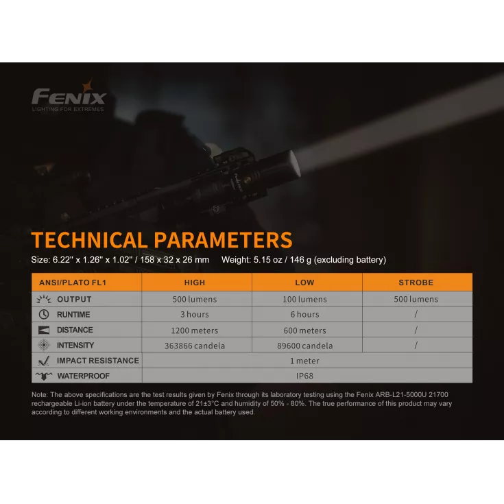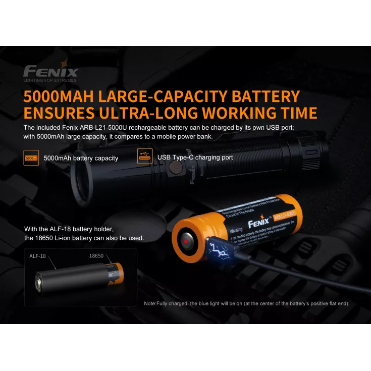 Includes: Fenix ARB-L21-5000U 21700 Li-ion battery, Type-C USB charging cable, holster, lanyard, spare o-ring.