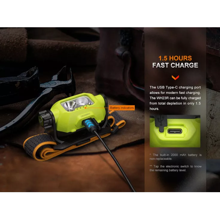 The Fenix WH23R headlamp has a maximum output of 600 lumens and a maximum beam distance of 100 meters. Powered by a built-in 2000 mAh battery, the lamp can be recharged using the USB-C charging port and fully recharged in as little as 1.5 hours.
