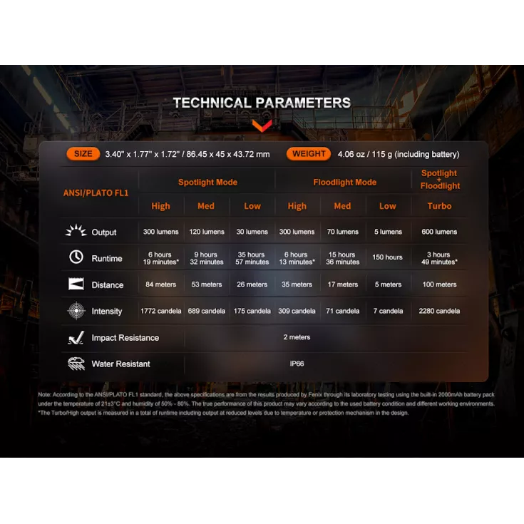 Combined beams: 600 lumens, 100 meter beam distance, 3.8 hour runtime.