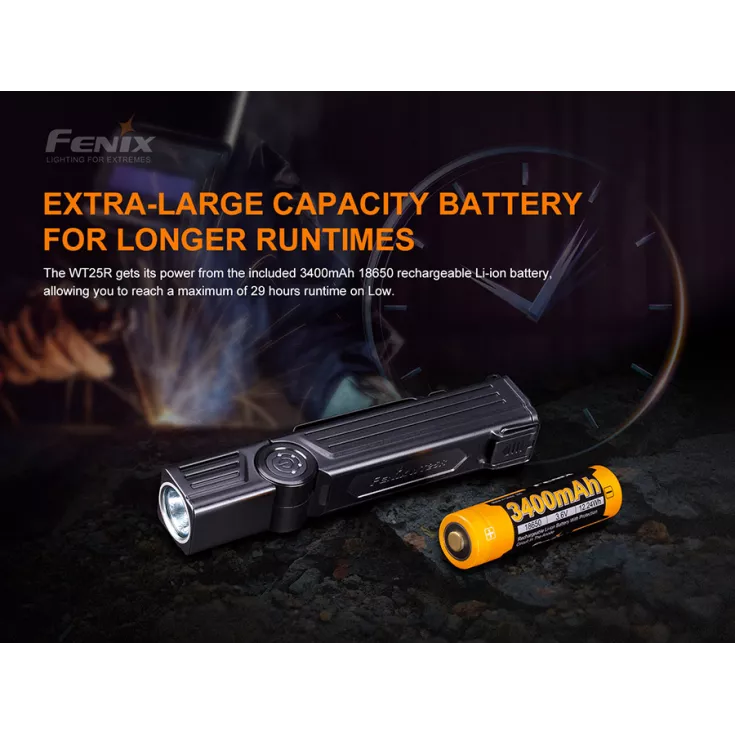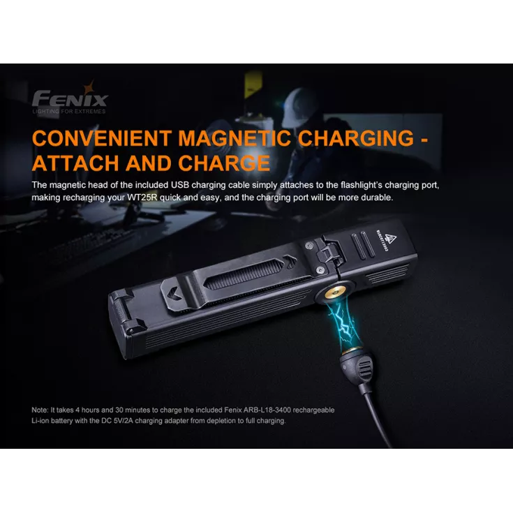 Fenix WT25R includes: Fenix ARB-L18-3400 rechargeable Li-ion 18650 battery, USB magnetic charging cable, lanyard and spare o-ring.