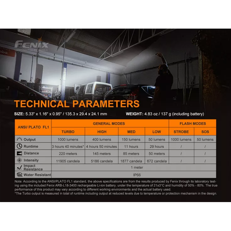 Turbo: 1000 lumens – 3 hours 40 minutes – 220 meters