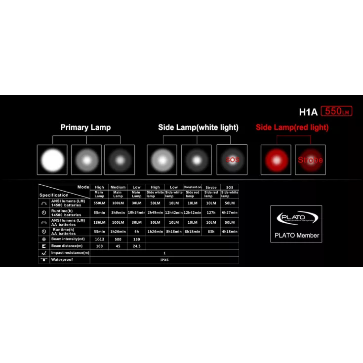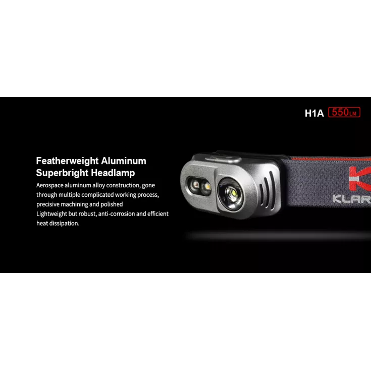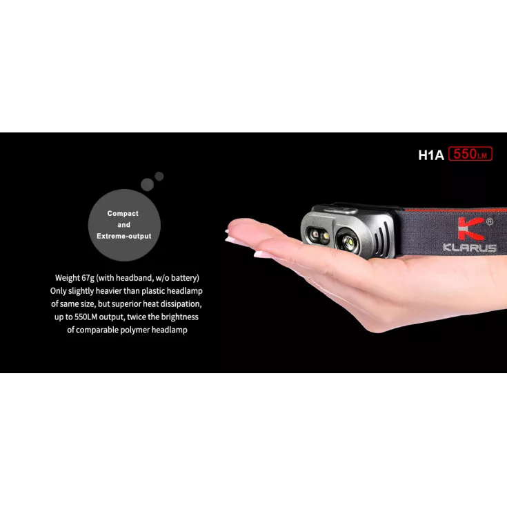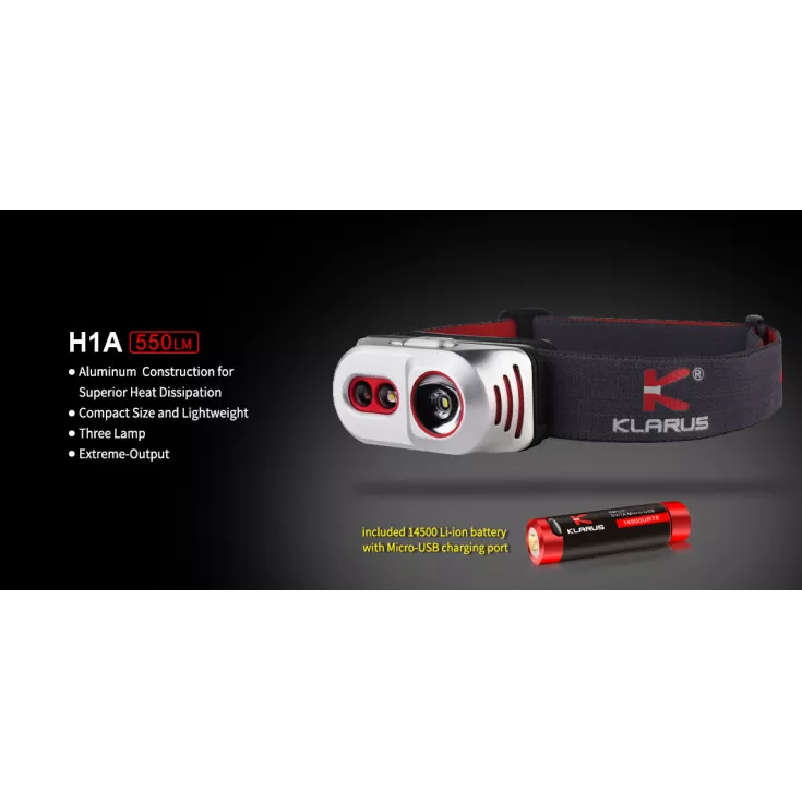 The Klarus H1A headlamp has a maximum output of 550 lumens from the Cree XP-L V6 LED and is powered by 1 x AA (alkaine or NiMH) or 14500 Li-ion battery. The head torch includes a Klarus 14500 cell with a micro USB charging port on the battery itself, eliminating the need for a separate charger.