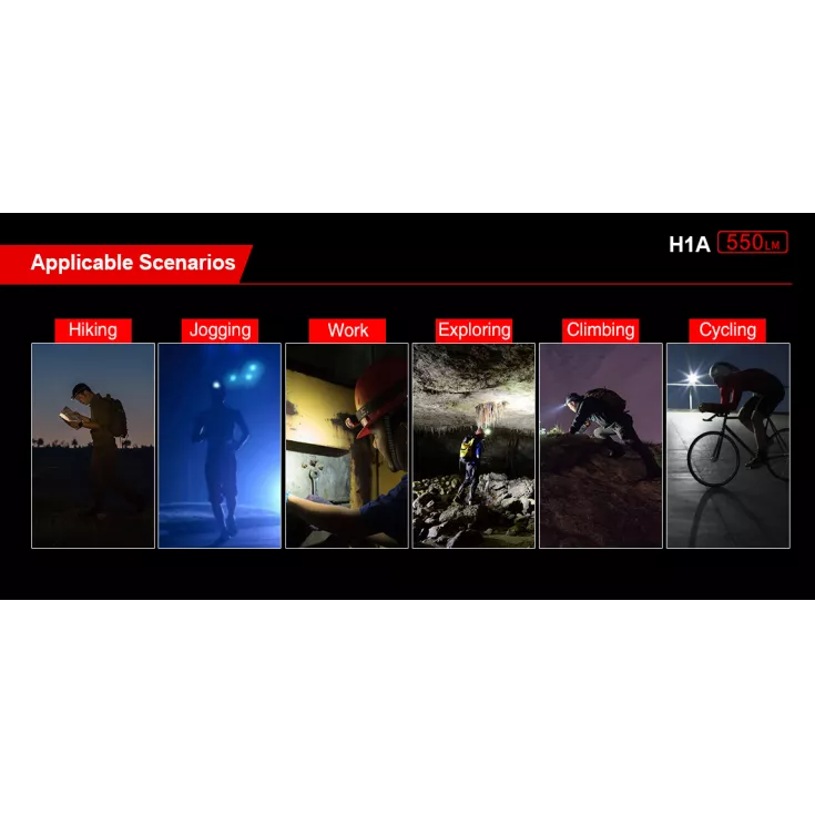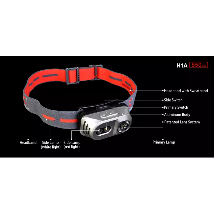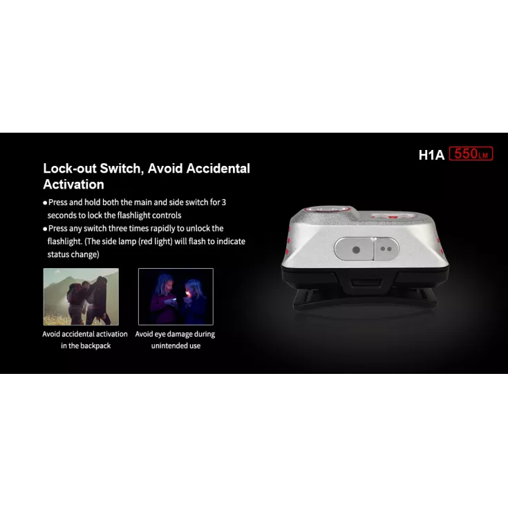 The headlight is operated by a dual switch which sits on top of the body. The larger button, the primary switch, is used to control the main light and its outputs and the side switch operates the secondary modes. The H1A features a lockout mode to avoid accidental activation; this is accessed by pressing and holding both switches simultaneously for 3 seconds. To exit lockout mode, rapidly press any switch three times.