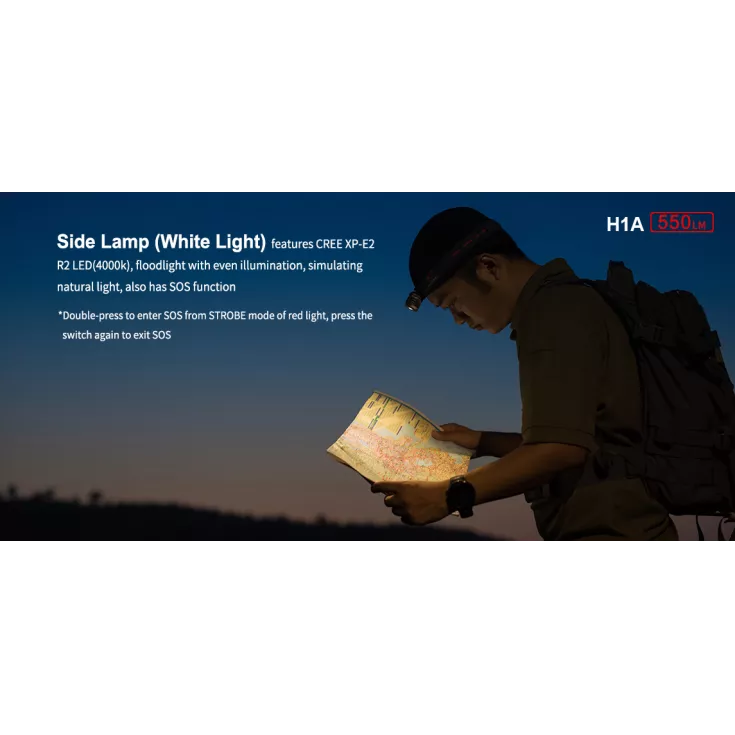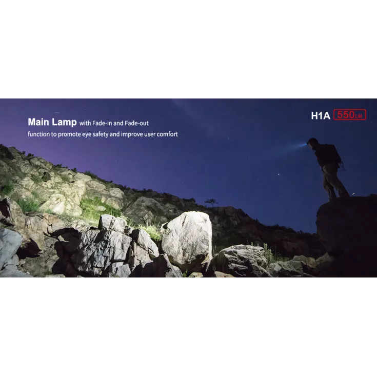 The primary white light offers a gentle fade in and out to ensure eye safety and improve user comfort. In addition to the main LED, the H1A features two secondary LEDs to allow the headlamp to suit a broad range of activities. One of these is a Cree XP-E2 R2 LED which provides a floodlight with a warm beam tint, ideal for close-up applications that require accurate colour rendering, such as map reading. The second is a red LED which is useful in emergency situations or to preserve night vision and penetrating fog.