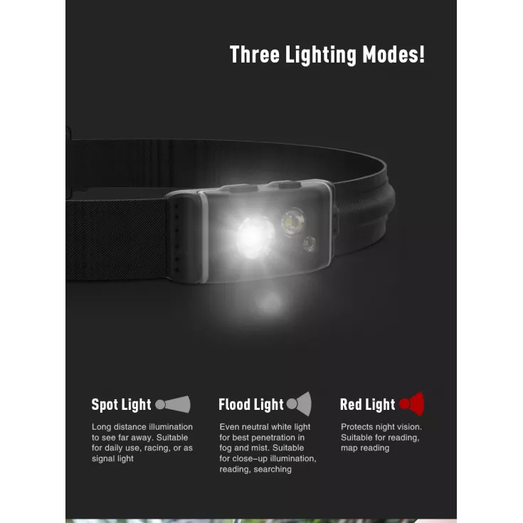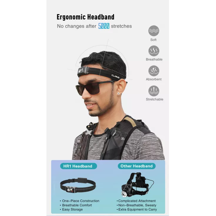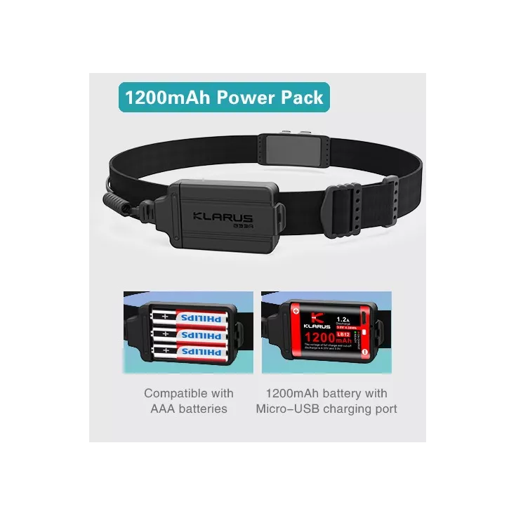 The Klarus HR1 Pro head torch has a maximum output of 400 lumens from the CREE XP-G2 cool white spotlight and CREE XP-G2 warm white floodlight. The light is powered by the Klarus B33A 1200mAh rechargeable li-ion battery which sits in a battery pack at the back of the headband. Alternatively the Klarus battery can be removed and 3 x AAA batteries (not included) used instead but please note, you cannot recharge AAA cells inside the pack.