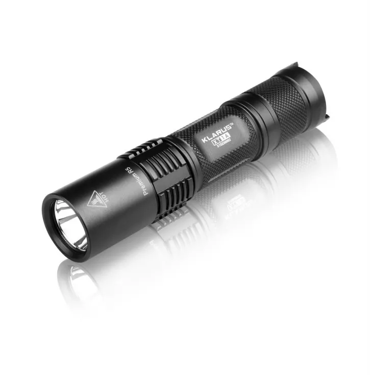 The Klarus XT1A handheld torch has a maximum output of 1000 lumens from the Cree XP-L HD V6 LED and is powered by 1 x 14500 Li-ion battery (included) or 1 x AA (alkaline or NiMH) cell. The battery that comes with the light is a Klarus 14500 Li-ion with a micro USB port for direct charging into the battery itself.