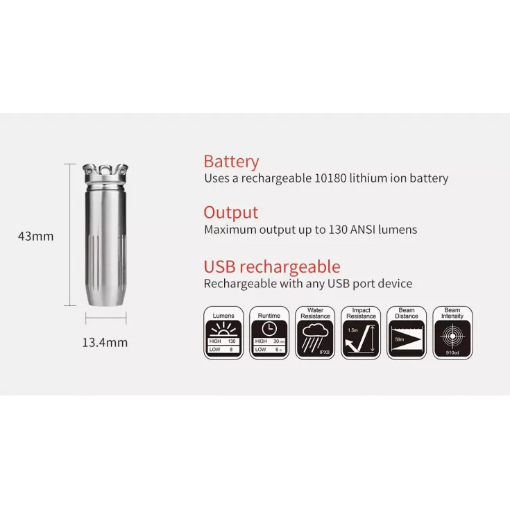 The MecArmy BL43 torch has a maximum output of 130 lumens from the Cree XP-G2 and is powered by 1 x 10180 Li-ion battery. The battery comes included with the torch and is rechargeable, allowing for quick and convenient charging when you are on the go.