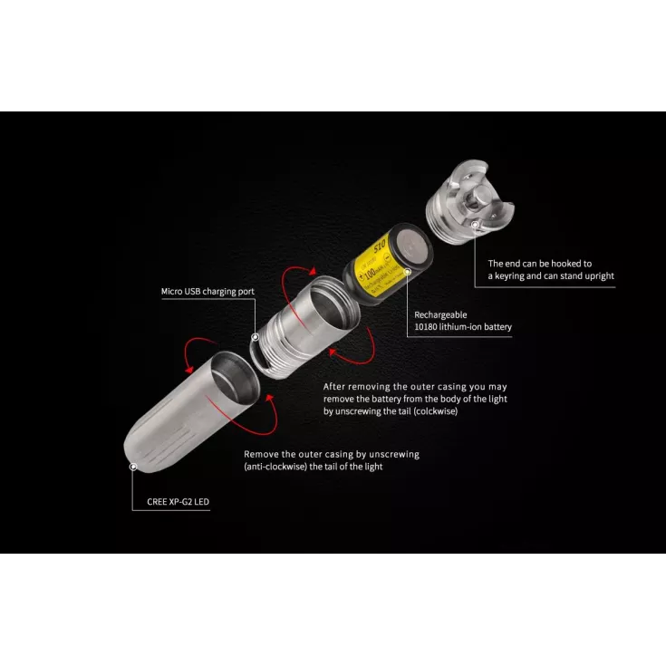 Includes: 1 x 10180 Li-ion battery, keyring split ring, spare o-rings, beaded neck attachment.