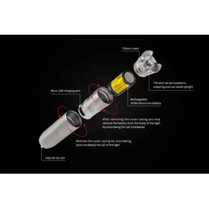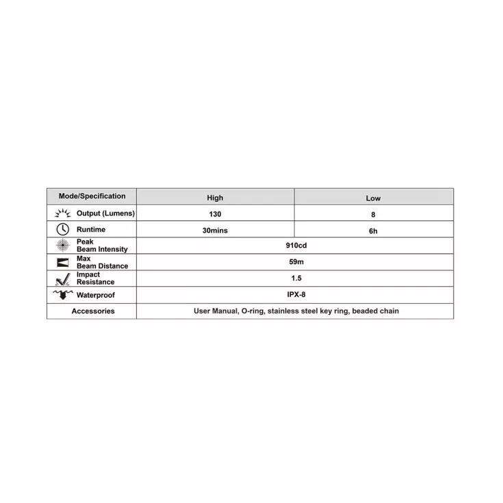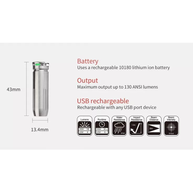 Includes: 1 x 10180 Li-ion battery, spare o-rings, keyring split ring, beaded neck attachment.