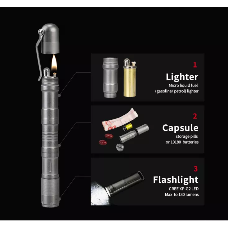 The X7S capsule capability can be used in one or two sized storage spaces and can keep items such as medication, notes or 10180 batteries safe and secure. The micro liquid (petrol) lighter completes the trio, creating a well-rounded tool and storage case for outdoor and everyday use.