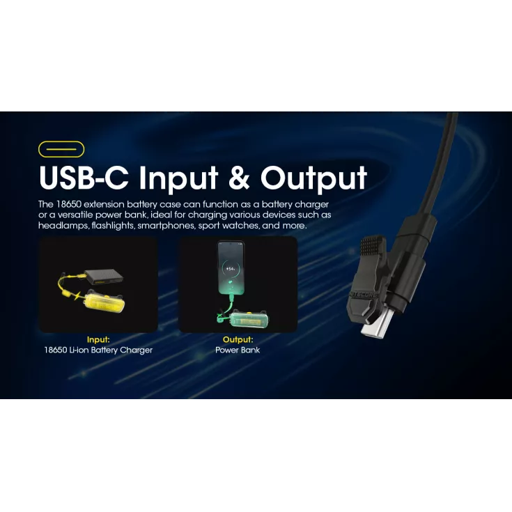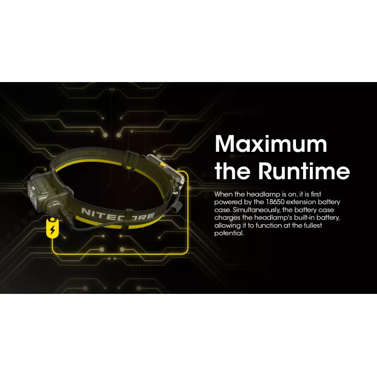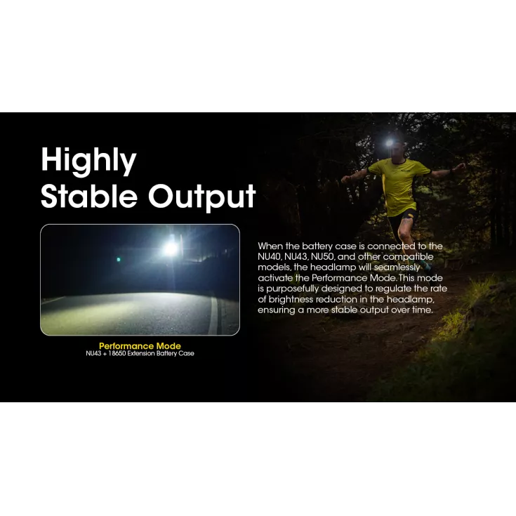 The Nitecore Extension Battery case features an 18650 li-ion battery and can be connected directly to your headlamp.