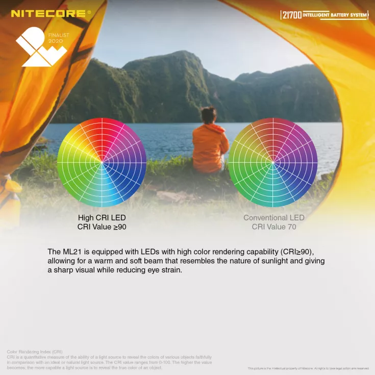 The Nitecore ML21 magnetic light offers a high CRI output with a maximum brightness of 80 lumens. Simply attach to the battery and use as a handheld or tail stand light. The CRI 90 rating provides a colour temperature between 4000K and 4500K which provides a warm beam that reduces eye strain and provides good colour retention.