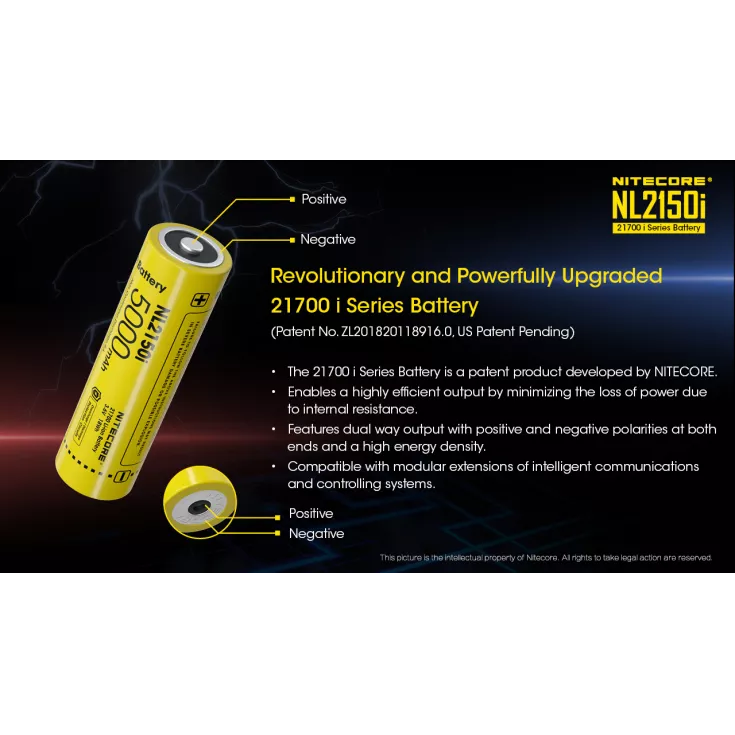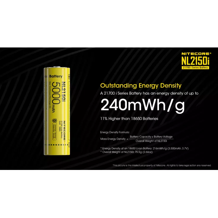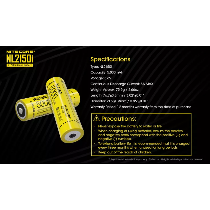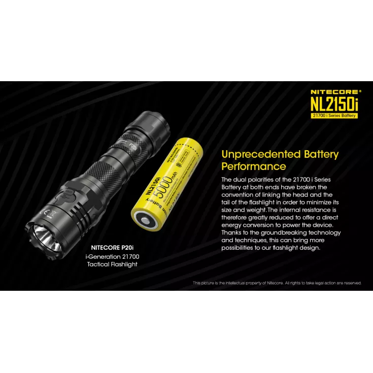 The Nitecore NL2150i 21700 battery is specifically designed for the Nitecore i Series, including the P10i and P20i flashlights. The cell has a capacity of 5000mAh and a maximum continuous discharge of 8A.
