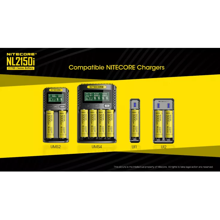 The Nitecore NL2150i 21700 battery can be charged in the following Nitecore chargers: UMS2, UMS4, UI1 and UI2.