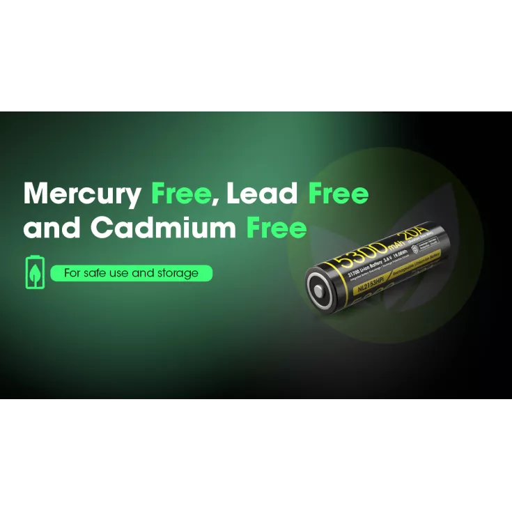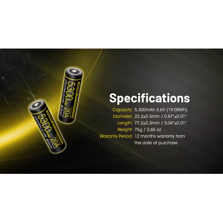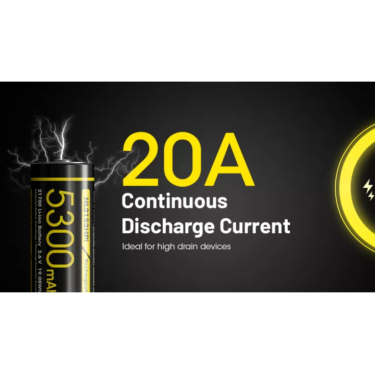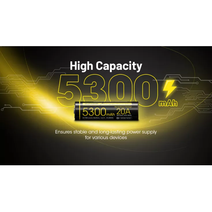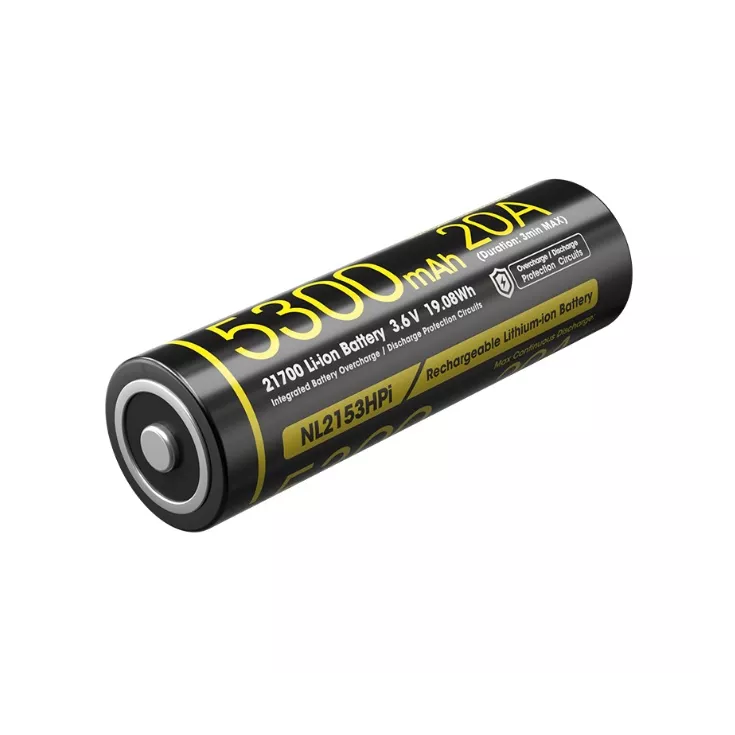 The Nitecore NL2153HPI is a high performance rechargeable 21700 li-ion battery with a high capacity of 5300mAh ensuring a stable, long lasting power supply for various devices and a 20A continuous discharge current (ideal for high drain devices).