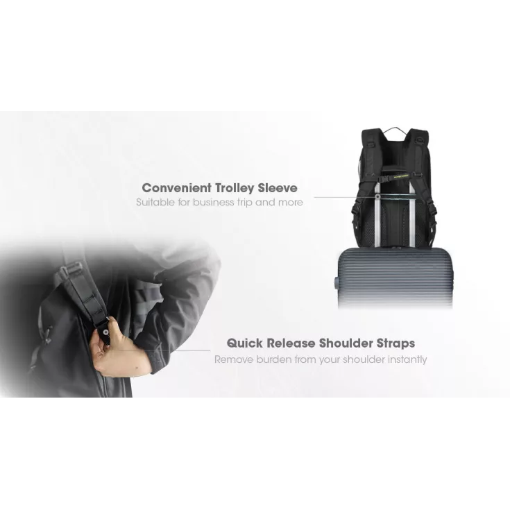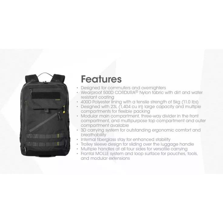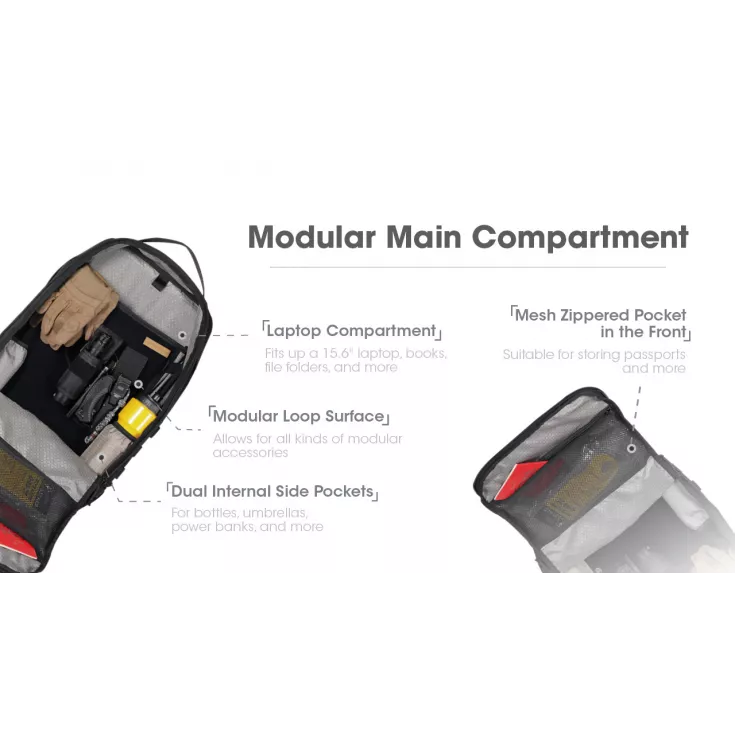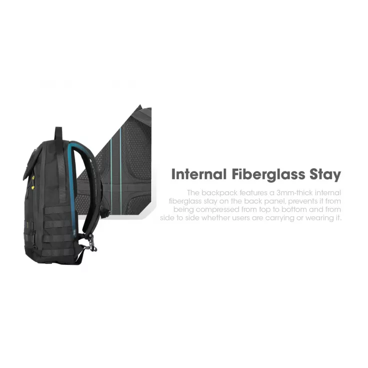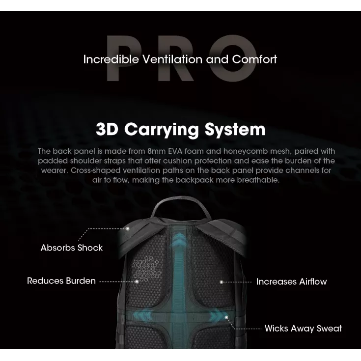 The back panel has cross-shaped ventilation paths providing channels for air to flow, making the backpack more breathable and padded shoulder straps offer cushion protection. The backpack features a convenient trolley sleeve making it suitable and versatile for business trips. It also features a MOLLE system, loop surface, strap mounting area and multiple handles on four sides.