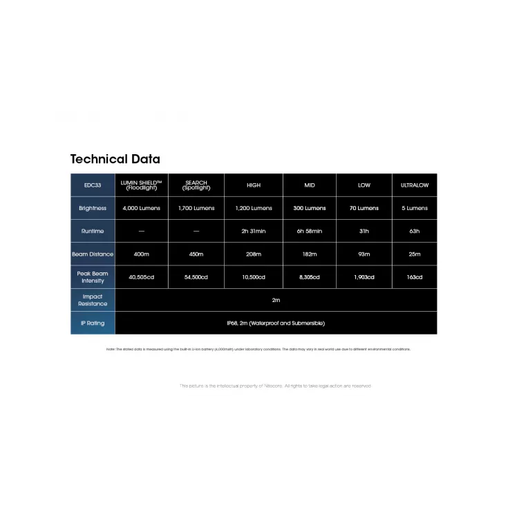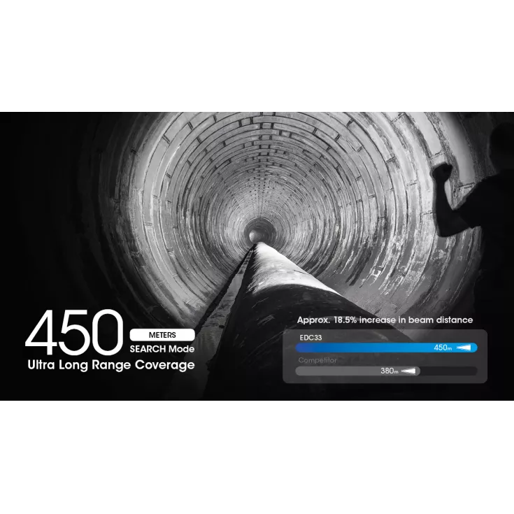 The Nitecore EDC33 brings several new and unique features to the high performance LED torch market. Featuring the all new NiteLab UHi 20 Max LED with a multi-core integrated design of a small yet high-intensity main core with 8 auxiliary cores arrayed together into a single LED. The result is a light that offers long-range coverage, extreme brightness and the ability to seamlessly switch between spotlight and floodlight. Thanks to the Supreme White Colour Consistency processing, it can emit a pure and soft white light.