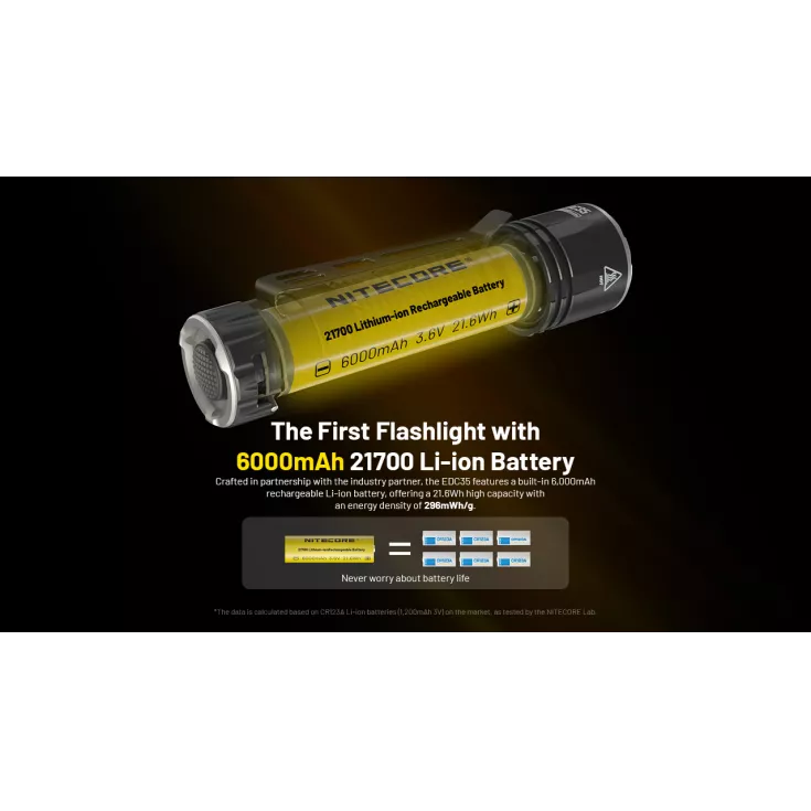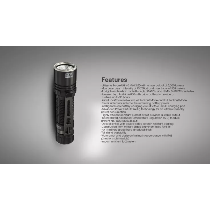 The EDC35 is rechargeable and features a built-in 6000mAh 21700 Li-ion battery. This makes the EDC35 the first flashlight to incorporate such a high performance 21700. The charging port is USB-C and is covered by a rotary protection cover, to protect against dust and dirt. Four power level display lights display the remaining battery power.