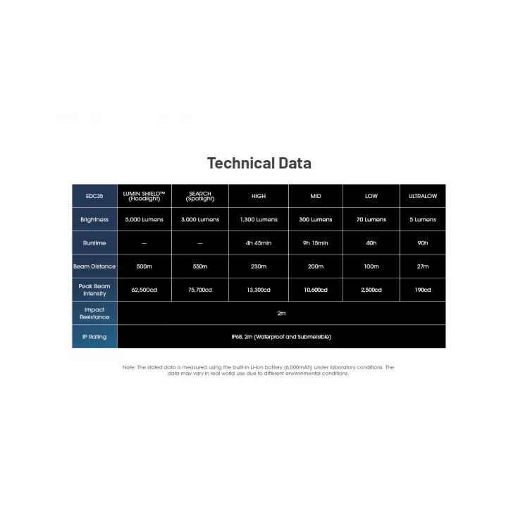 Another feature that sets the EDC35 apart from the competition is the sensor protection function. When the built-in optical sensor detects an obstruction close to the lens, the brightness will automatically decrease to avoid overheating.