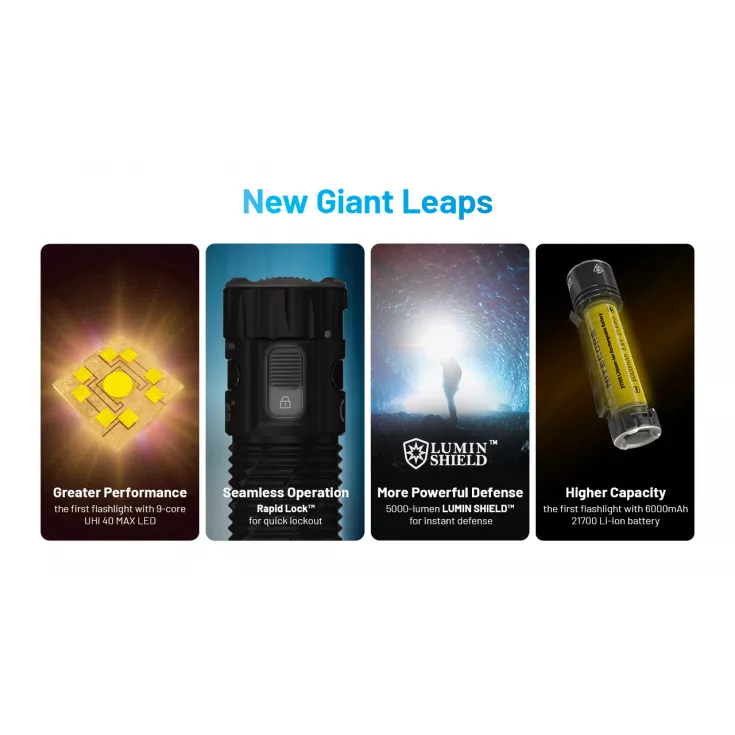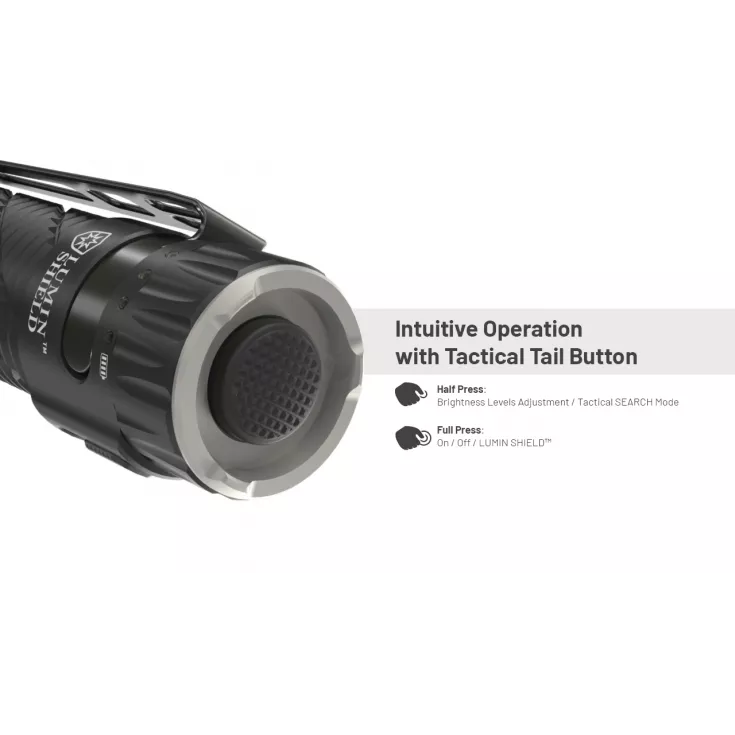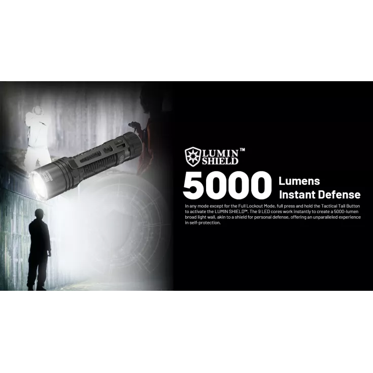 Lumin Sheild feature means that in any mode (except for full lockout) a full press and hold of the tail button activates all 9 LED cores to create a 5000 lumen wall of light, offering an unparalleled experience in self-protection.