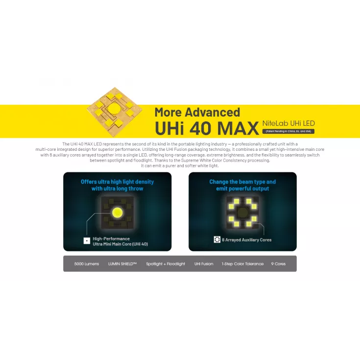 The Nitecore EDC35 utilises the new UHi 40 MAX LED, with a multi-core integrated design for superior performance. Utilising UHi fusion package technology, it combines a small yet high intensity main core with 8 auxiliary cores, arrayed together in a single LED, offering long range coverage, extreme brightness, and the flexibility to seamlessly switch between spotlight and floodlight. Thanks to the Supreme White Colour consistency processing it can emit a purer and softer white light.