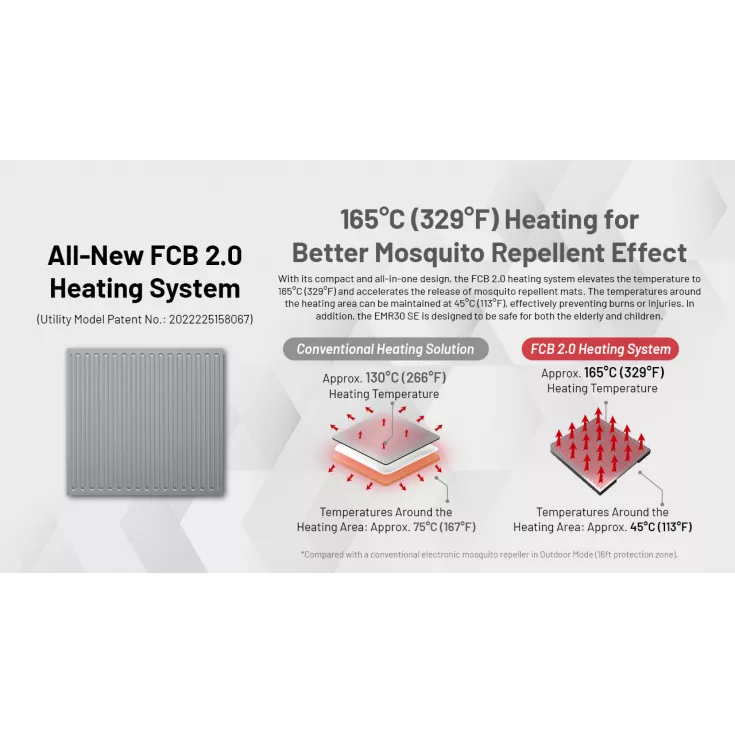 The Electronic multipurpose repeller features all new FCB 2.0 heating system. The system elevates the temperature to 165°c and accelerates the release of the mosquito repellent mats. The temperature around the heating area can be maintained to 45°c preventing burns or injuries.