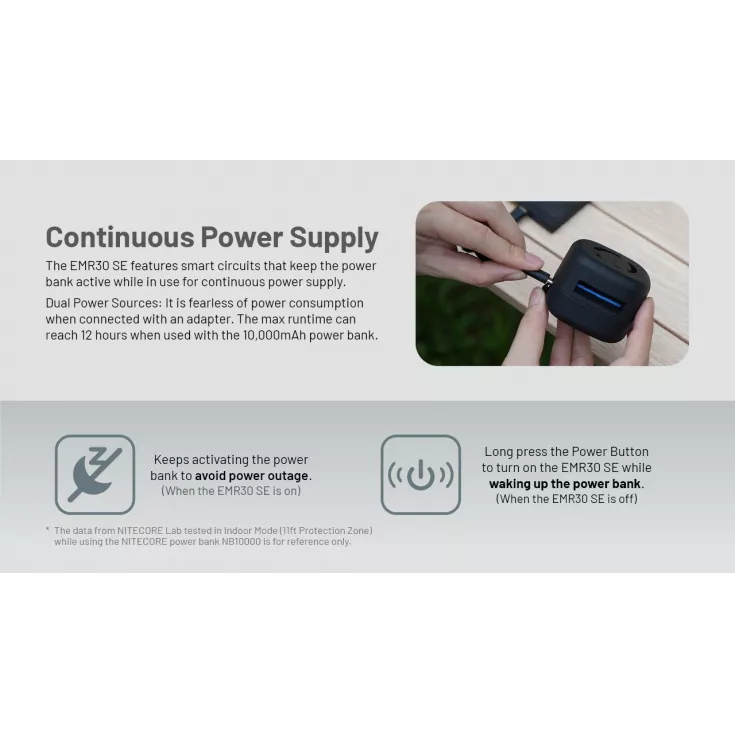 The EMR30 SE also features smart circuits for a continuous power supply. It requires an external power source, such as a power bank or USB adapter to plug in a wall socket (not included).