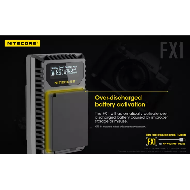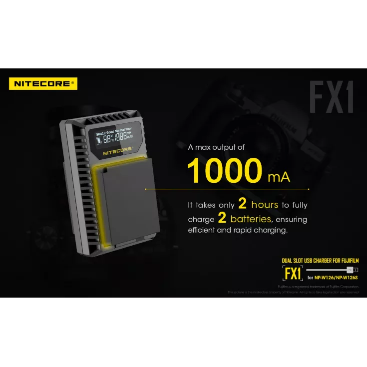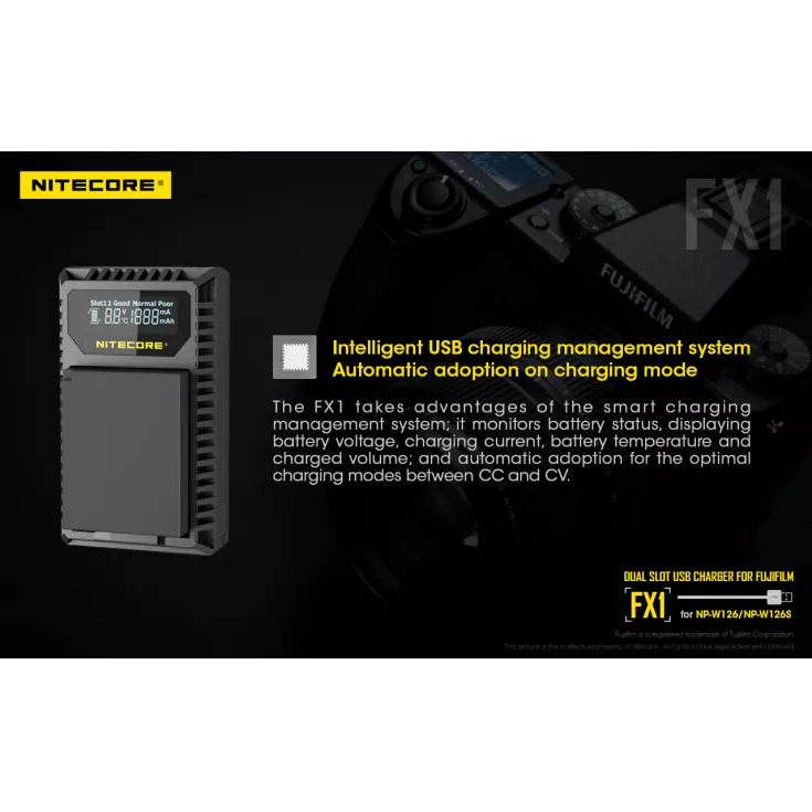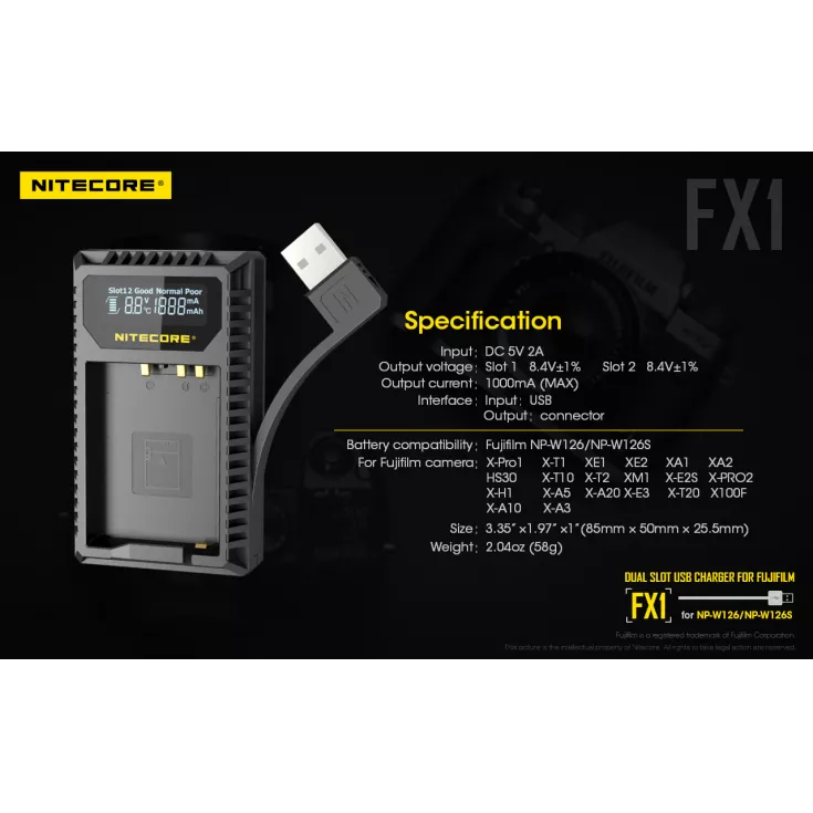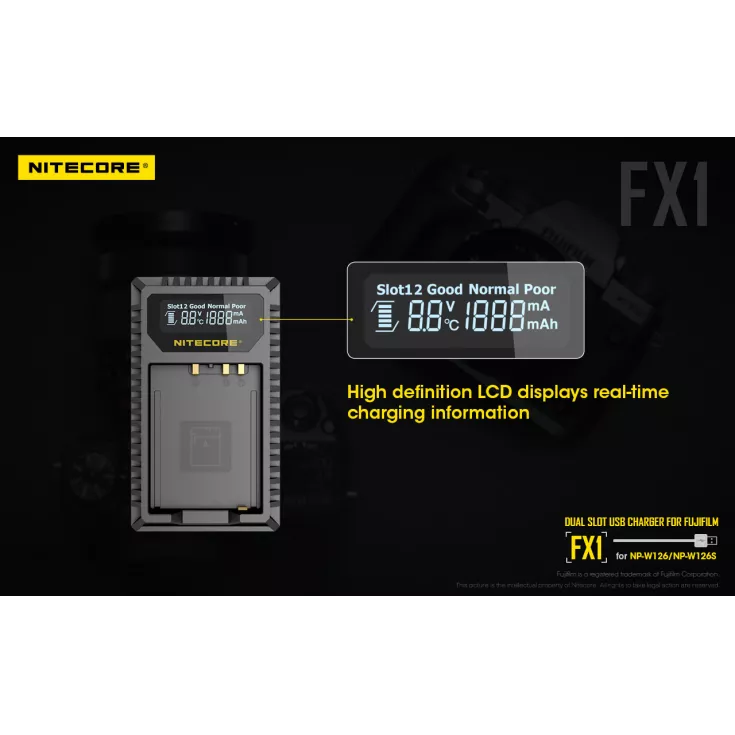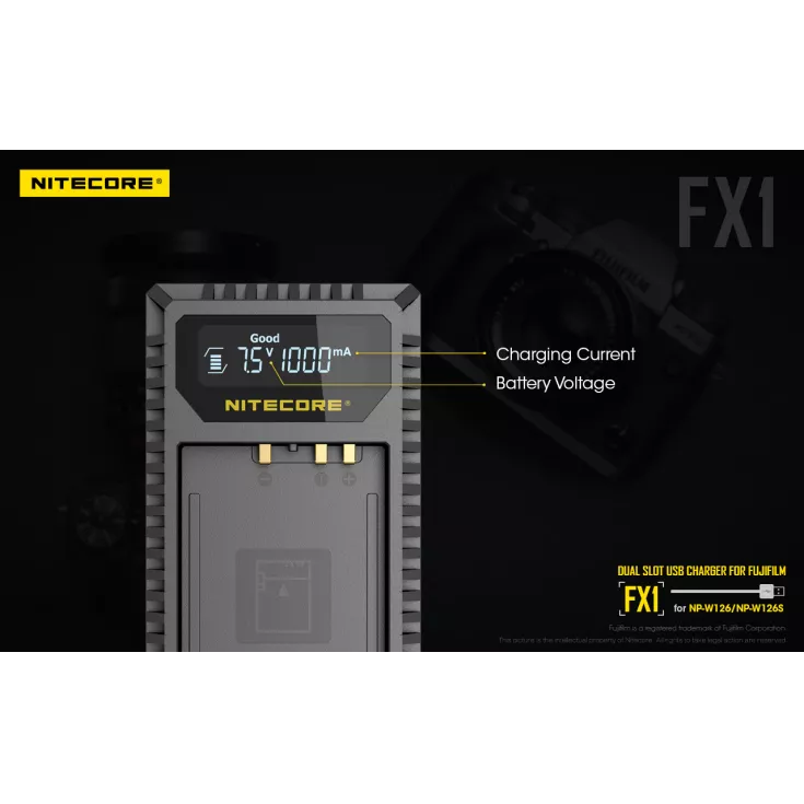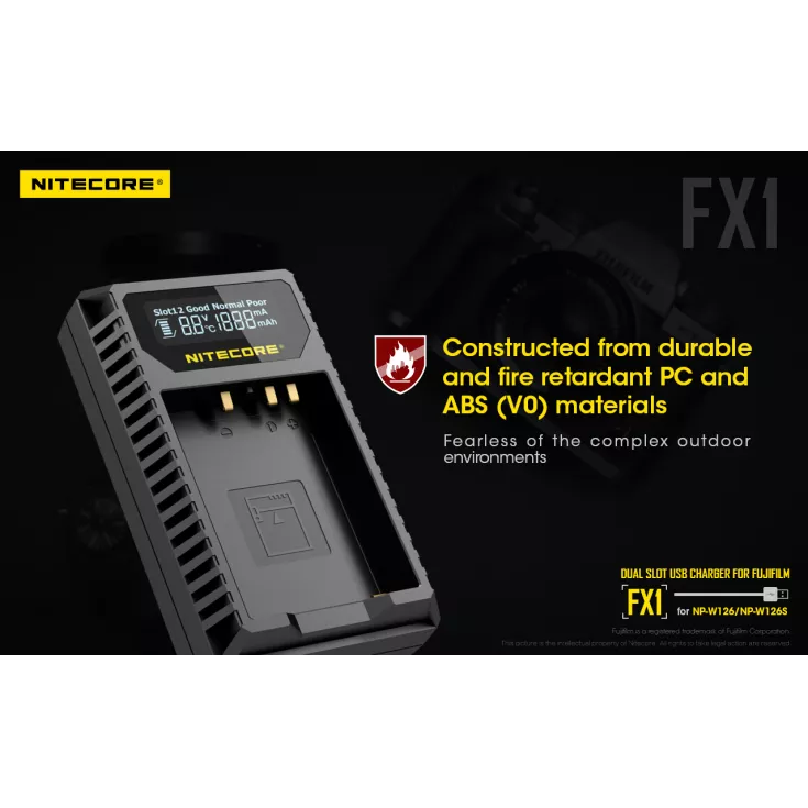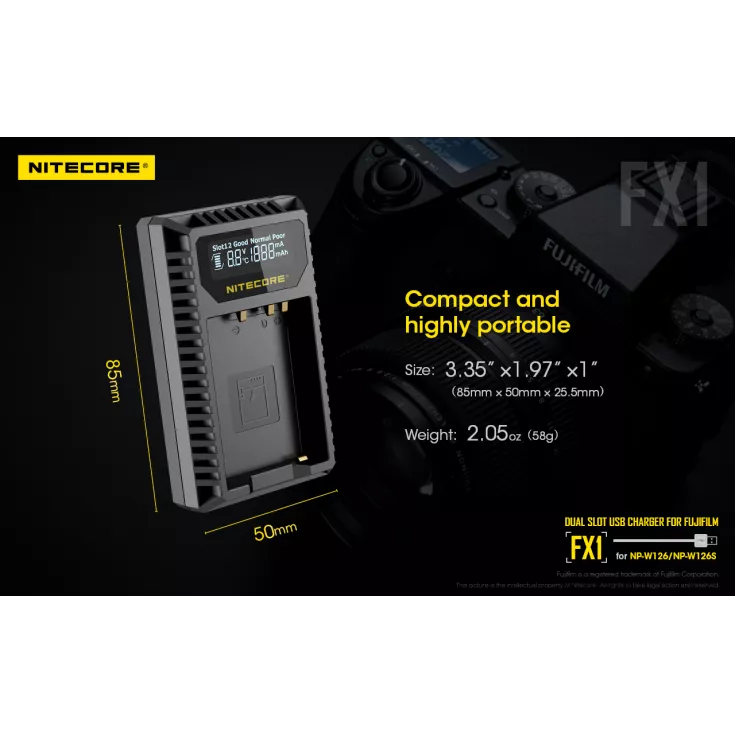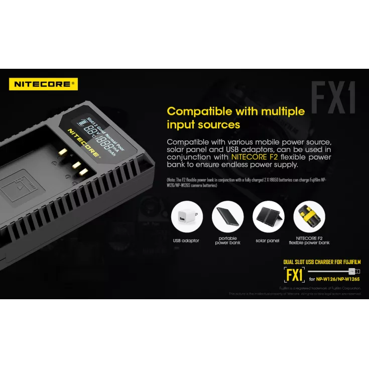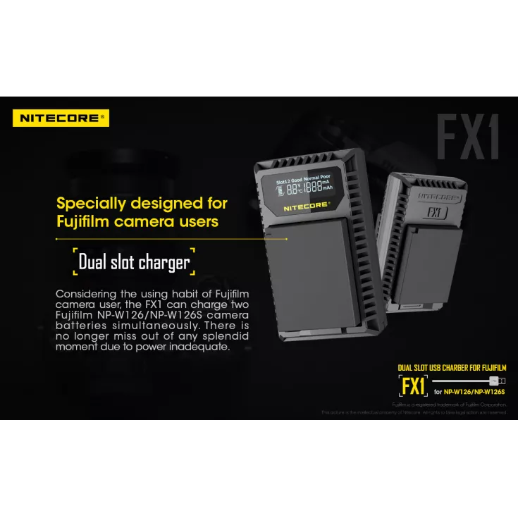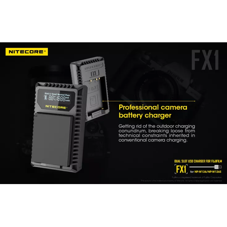 The Nitecore FX1 is a dual slot USB charger for the Fujifilm NP-W126 and NP-W126S camera batteries. Ideal for travelling photographers, the charger is compact, lightweight and extremely portable.