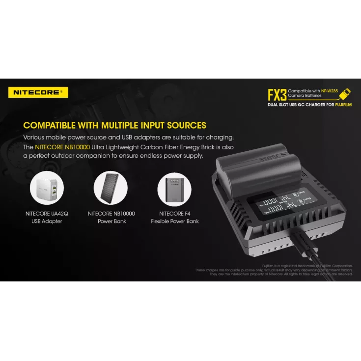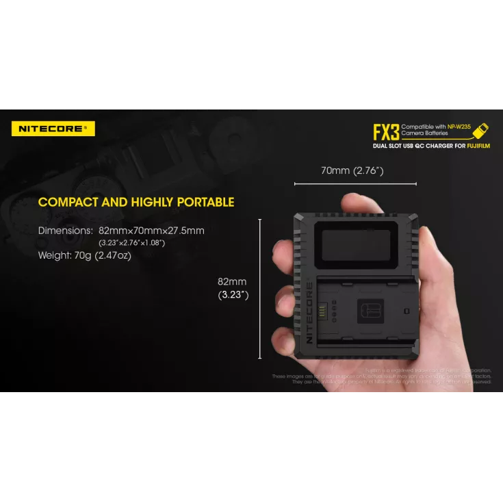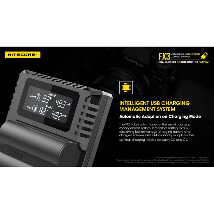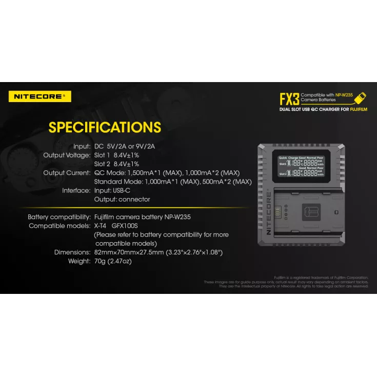 The Nitecore FX3 is a dual slot USB-C QC charger for the Fujifilm NP-W235 camera battery. With QC fast charge input available, the FX3 has a maximum output of 1500mA when using a single slot or 1000mA when using both slots. The charger has a USB-C input and comes with a charging cable (QC adapter available separately).