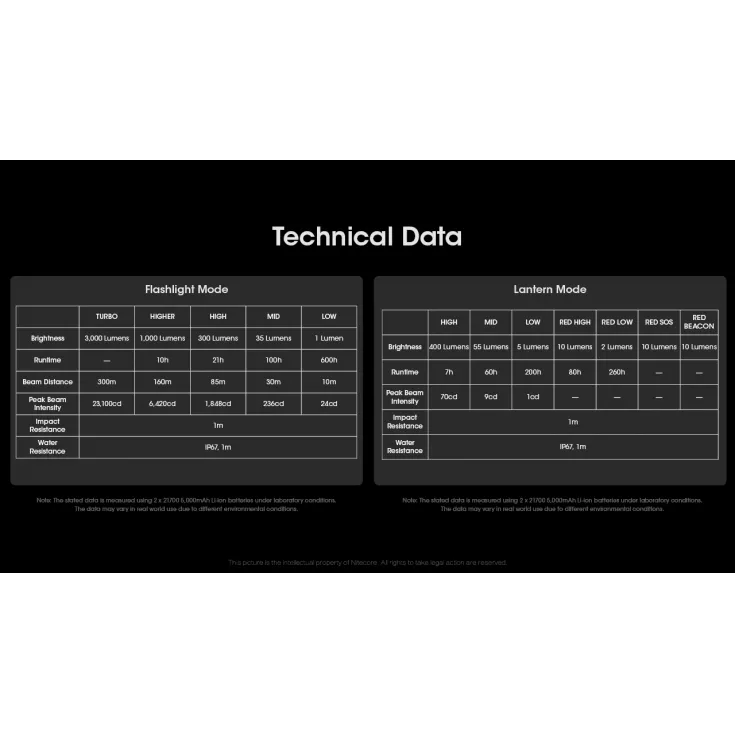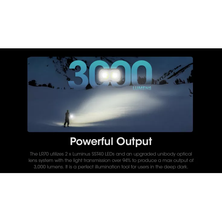 The Nitecore LR70 3-in-1 rechargeable lantern flashlight has a maximum output of 3000 lumens created by the 2 x luminus SST40 LEDs. It’s design allows the flashlight to be used as a lantern and flashlight as well as a power bank when you need a little extra charge. The lantern is powered by a built-in 10,000mAh battery.