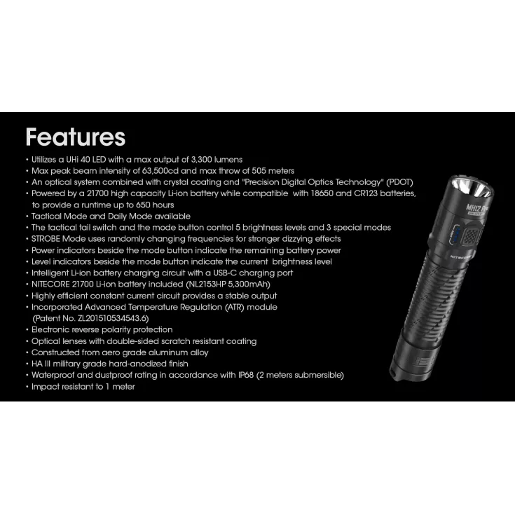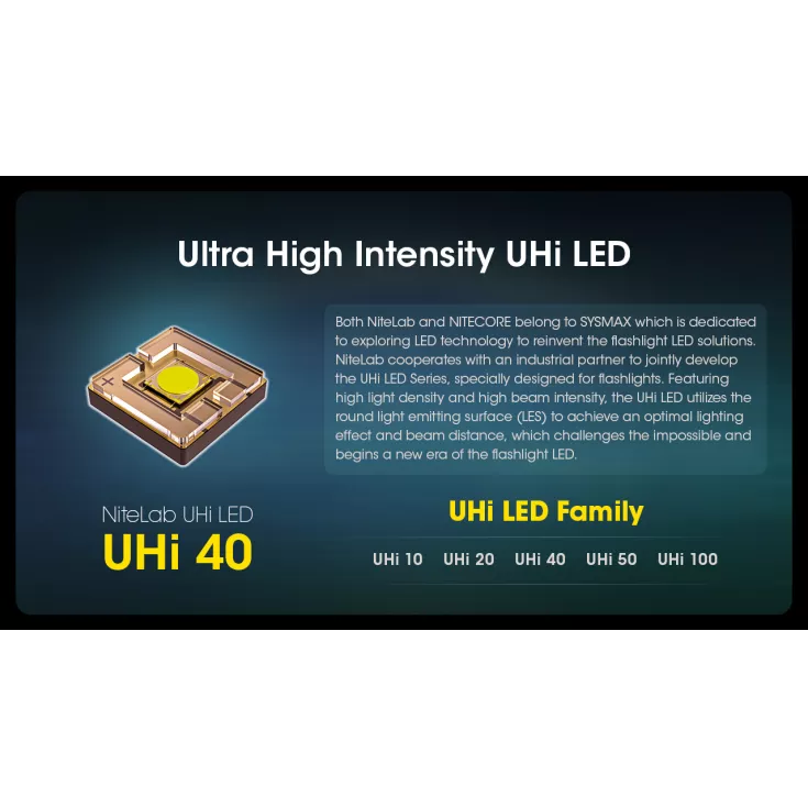 The Nitecore MH12 Pro is the first flashlight to utilise the new ultra high intensity UHi 40 LED, which has been developed in collaboration by Nitecore and Nitelab, to achieve an optimal lighting effect from a round light emitting surface.