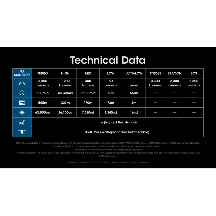 Turbo: 3300 lumens – 30 minutes* – 505 meters