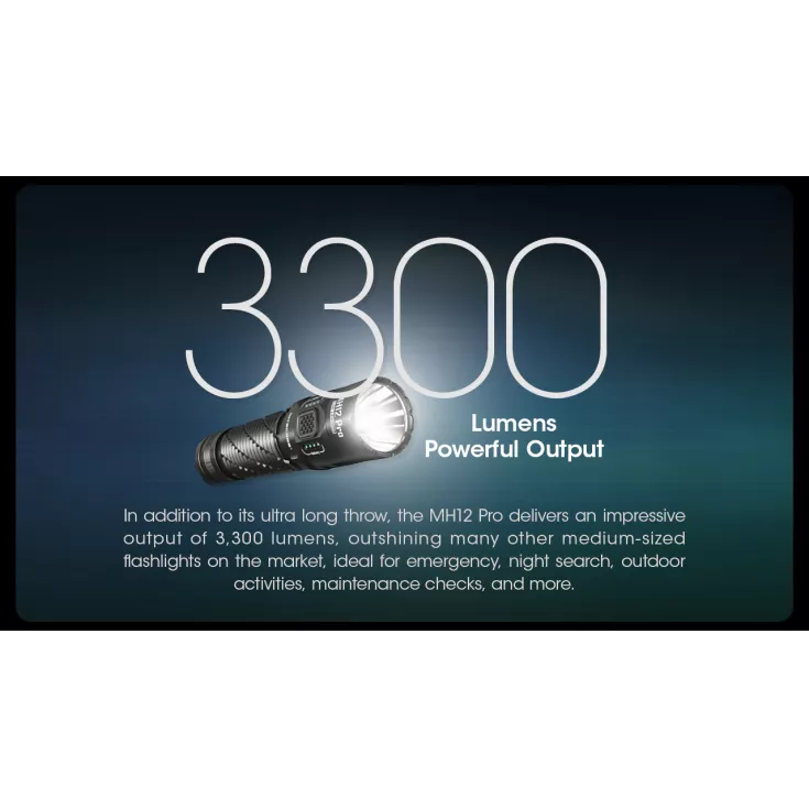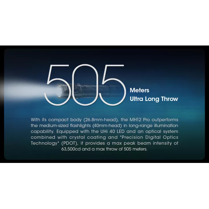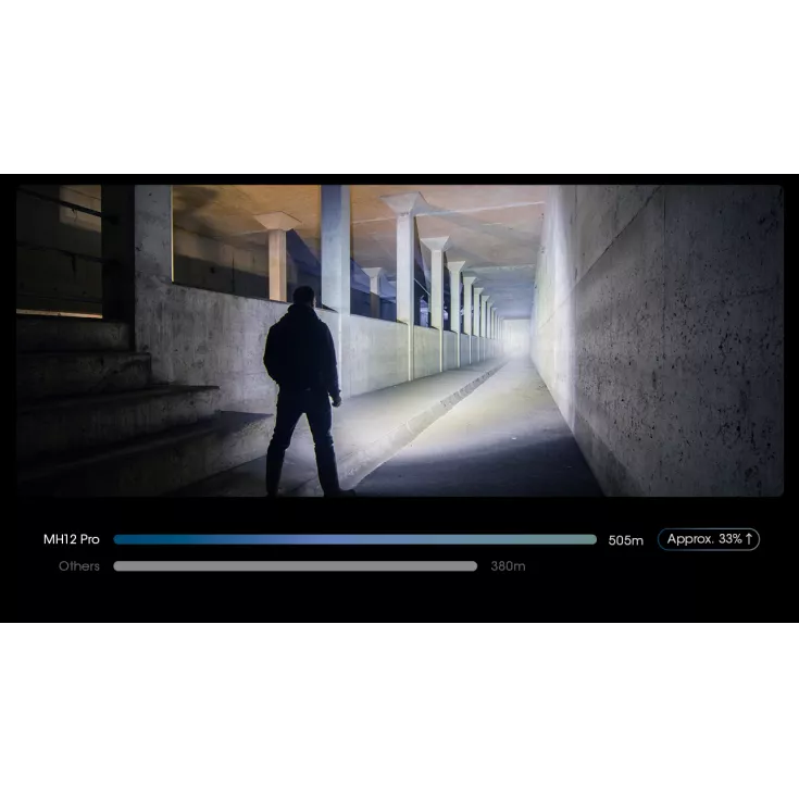 Despite its compact dimensions the MH12 Pro has a range of up to 505 meters with a maximum output of 3300 lumens.