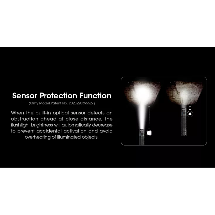 A built-in optical sensor detects obstructions in front of the LED and will automatically decrease the brightness to prevent accidental overheating.