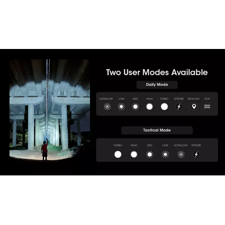 User friendly operation with a tactical tail switch for on/ off with momentary-on functionality plus separate mode button to change brightness and mode. Two user modes are available; daily mode for general operation and a tactical mode.