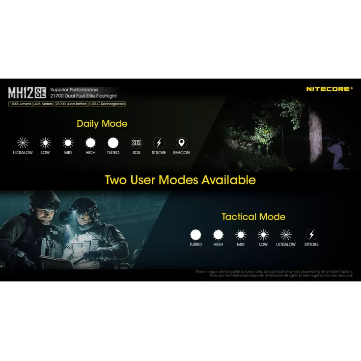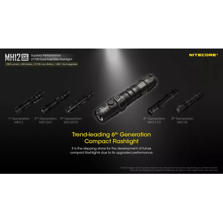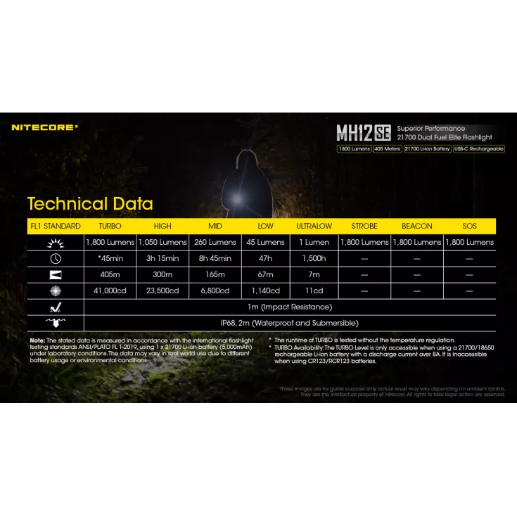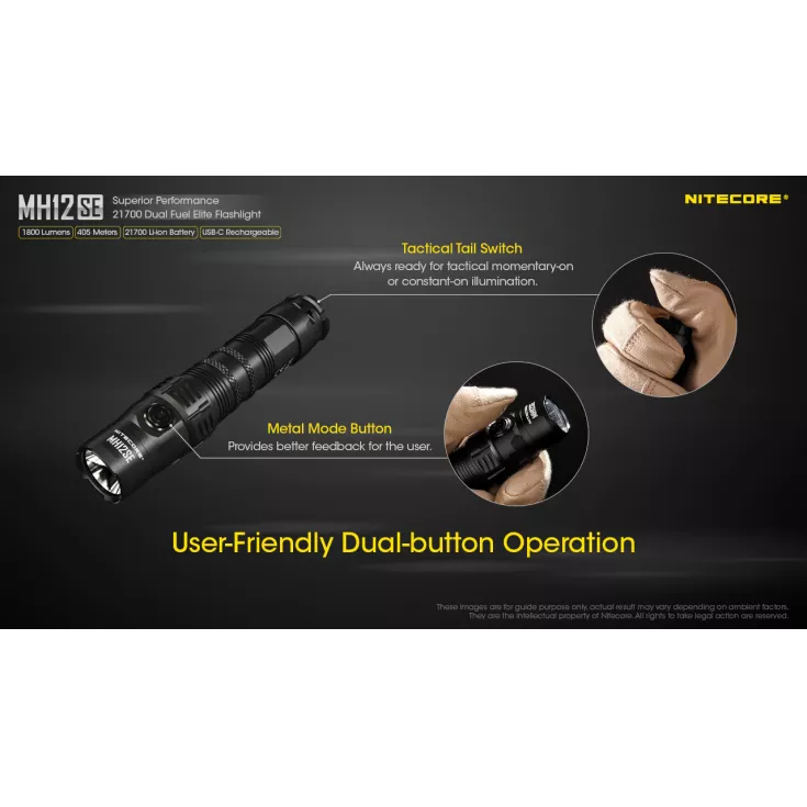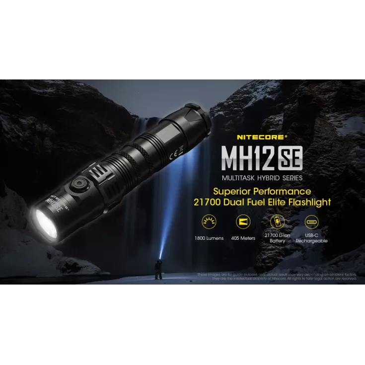 The Nitecore MH12SE superior performance 21700 dual fuel elite flashlight is equipped with a Luminus SFT-40-W LED providing a maximum output of 1800 lumens and an impressive throw of 405 meters.