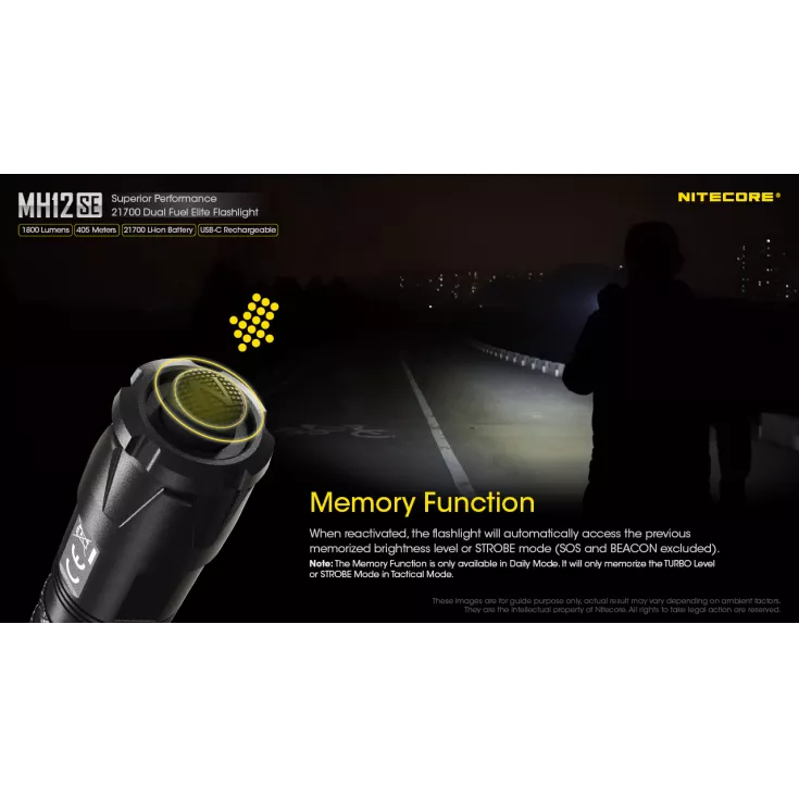 Two user modes are available to setup the MH12SE depending on user requirements. Daily mode features all brightness levels and flashing modes, while tactical mode eliminates SOS and Beacon settings. Memory function feature enables the MH12SE to remember the last used brightness or strobe mode and when reactivated from off (SOS and beacon excluded). Note: The memory function is only available in daily mode. It will only memorise turbo or strobe in tactical mode.