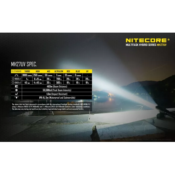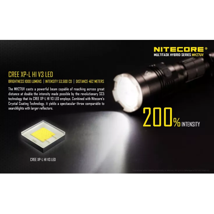The Nitecore MH27UV has a maximum output of 1000 lumens from the Cree XP-L HI V3 and is powered by either 1 x 18650 Li-ion (recommended) rechargeable battery or 2 x CR123 single use batteries.