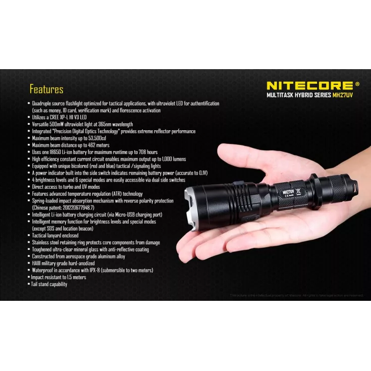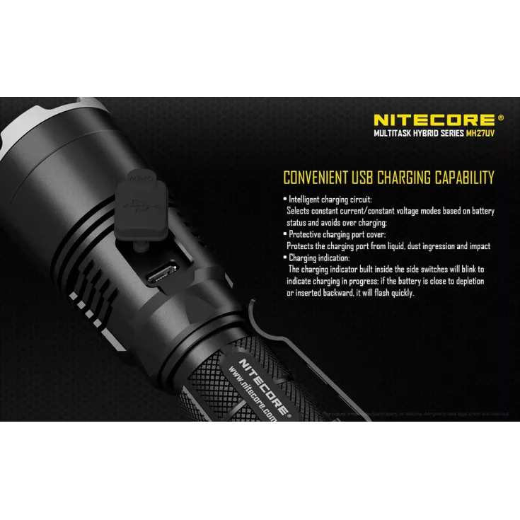Enhanced by the Cree XP-L HI V3 LED and Nitecore’s Crystal Coating Technology, the Nitecore MH27UV offers an unprecedented beam concentration and an incredible throw of up to 462 meters. As with all torches in the MH series, this model is rechargeable, which allows for an 18650 Li-ion battery to be charged inside the torch using the provided Micro USB cable. This feature provides ease and convenience as an external battery charger is not required.